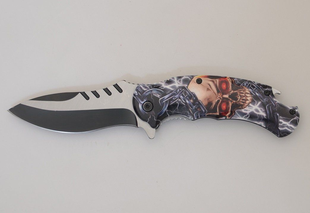 Couteau pliant Tête de mort yeux rouges avec chaîne lame de 9 cm